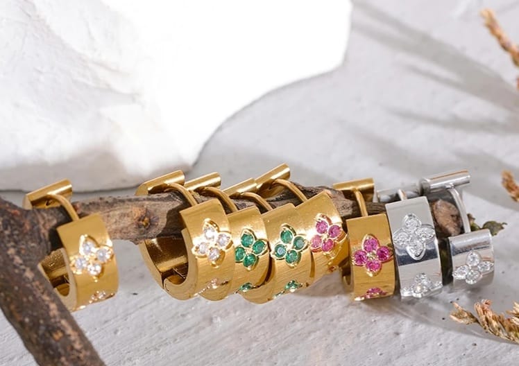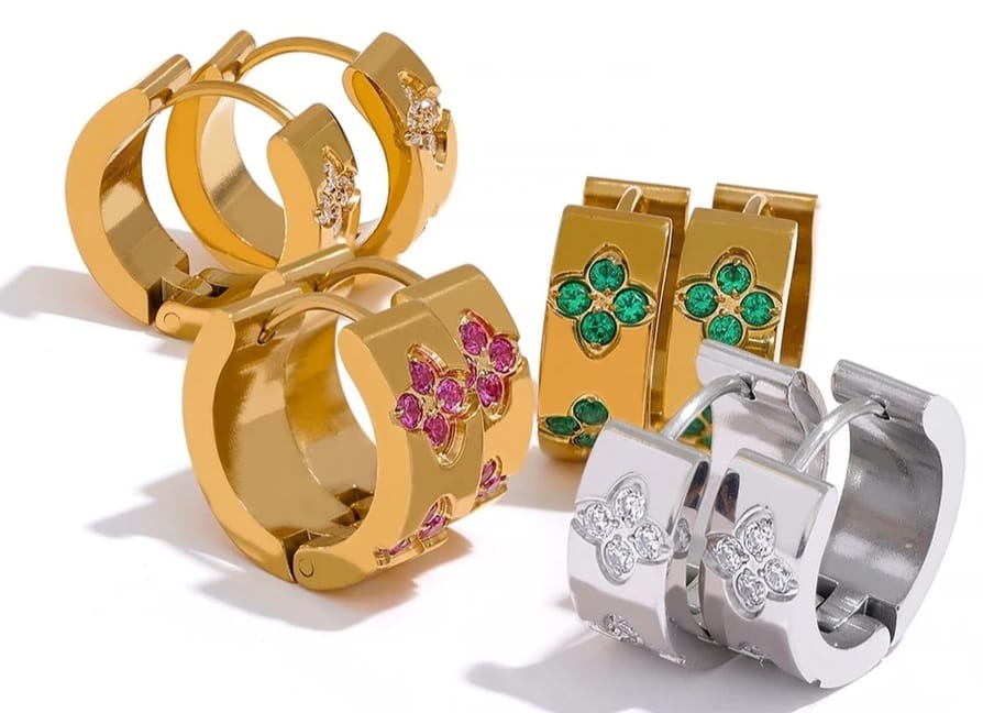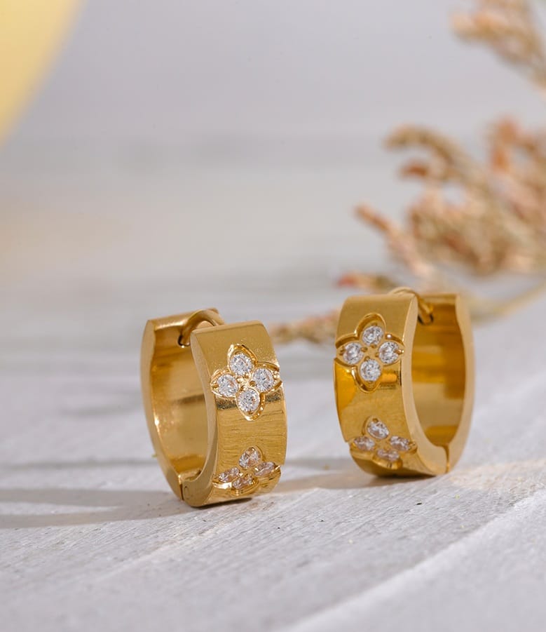 CRÉOCLOVERS: Cette subtile paire de créoles en acier inoxydable finement plaqué or 18 carats incrustée de zirconium venant lui offrir d’originales fleurs treflées est idéale pour une touche affirmée mais raffinée.