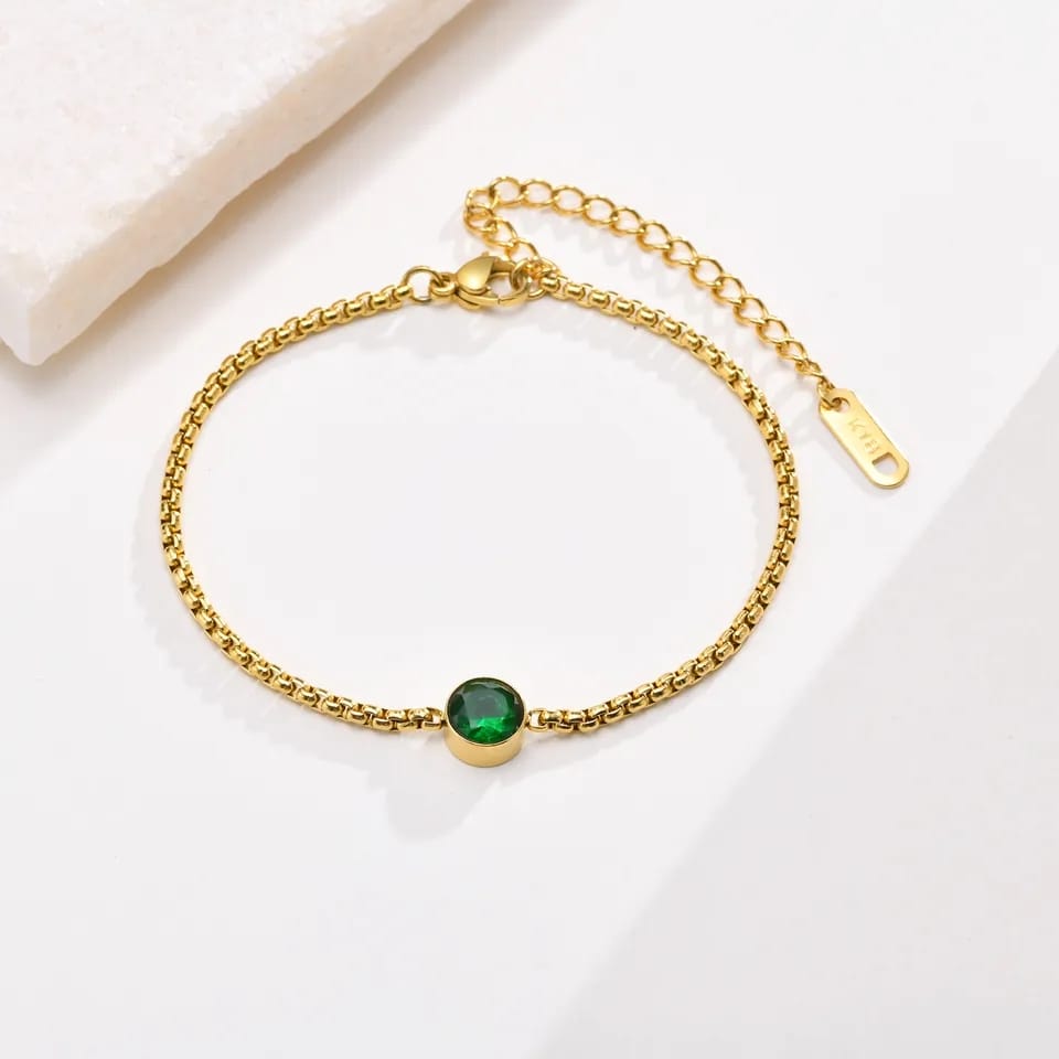 Fine gourmette en acier inoxydable plaqué or 18 carats, centrée d’une pierre ronde zircon vert. Légère et esthétique.