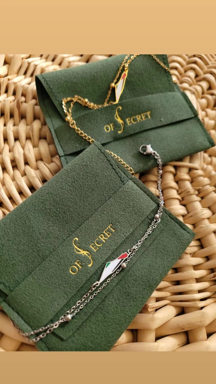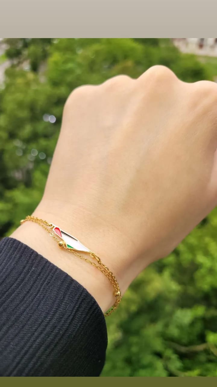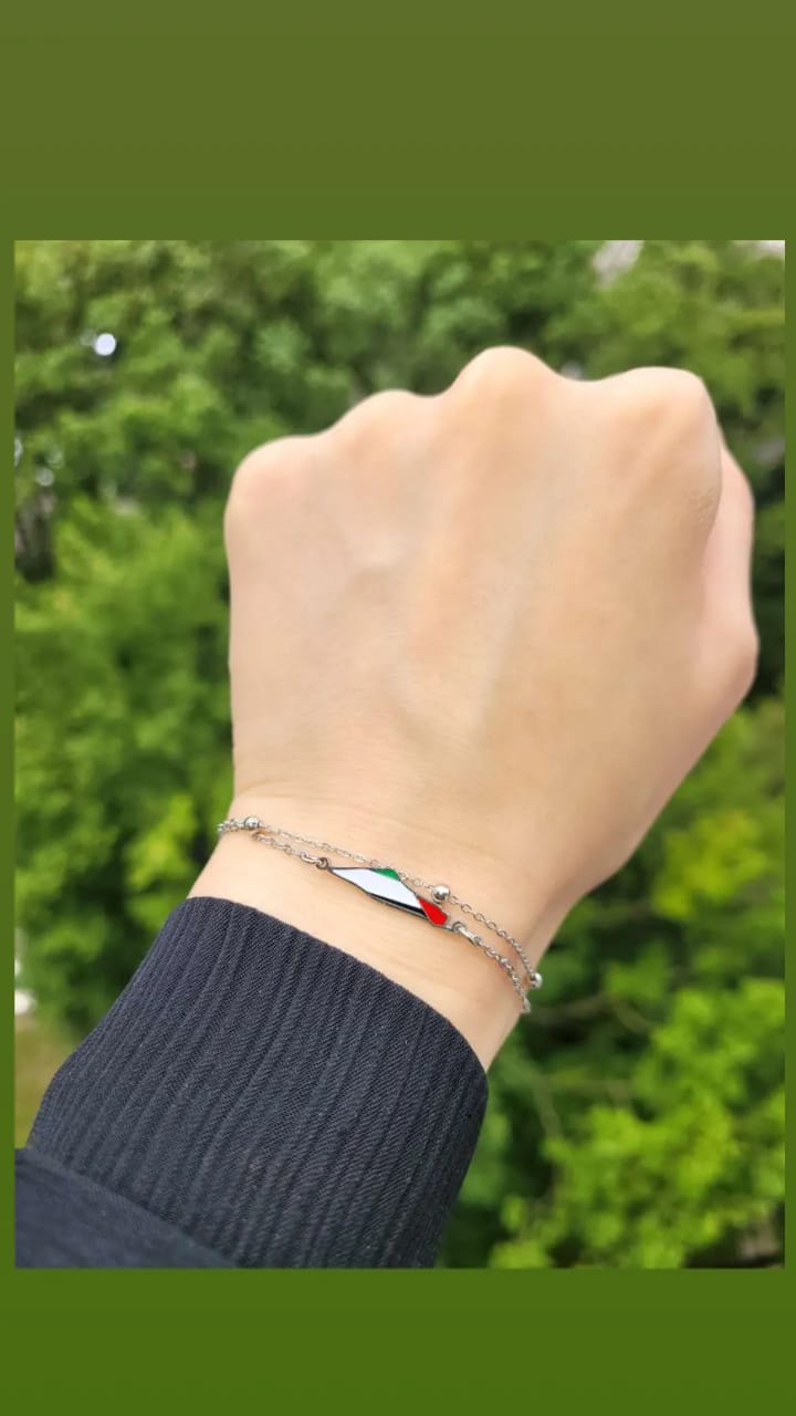 Cette fine gourmette disponible en acier inoxydable couleur argent ou doré donc finement plaqué or 18 carats , est doublée et représente la carte de la Palestine avec les couleurs de son drapeau ... Des couleurs qui ont une histoire qui nous appartient d'écrire à nouveau !