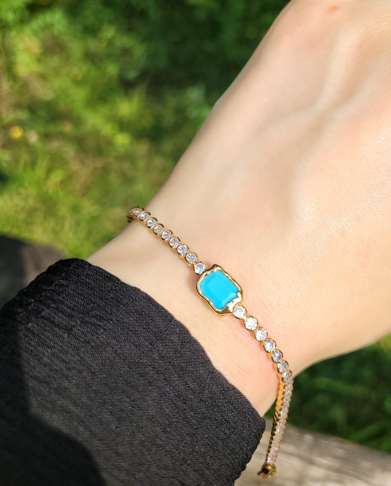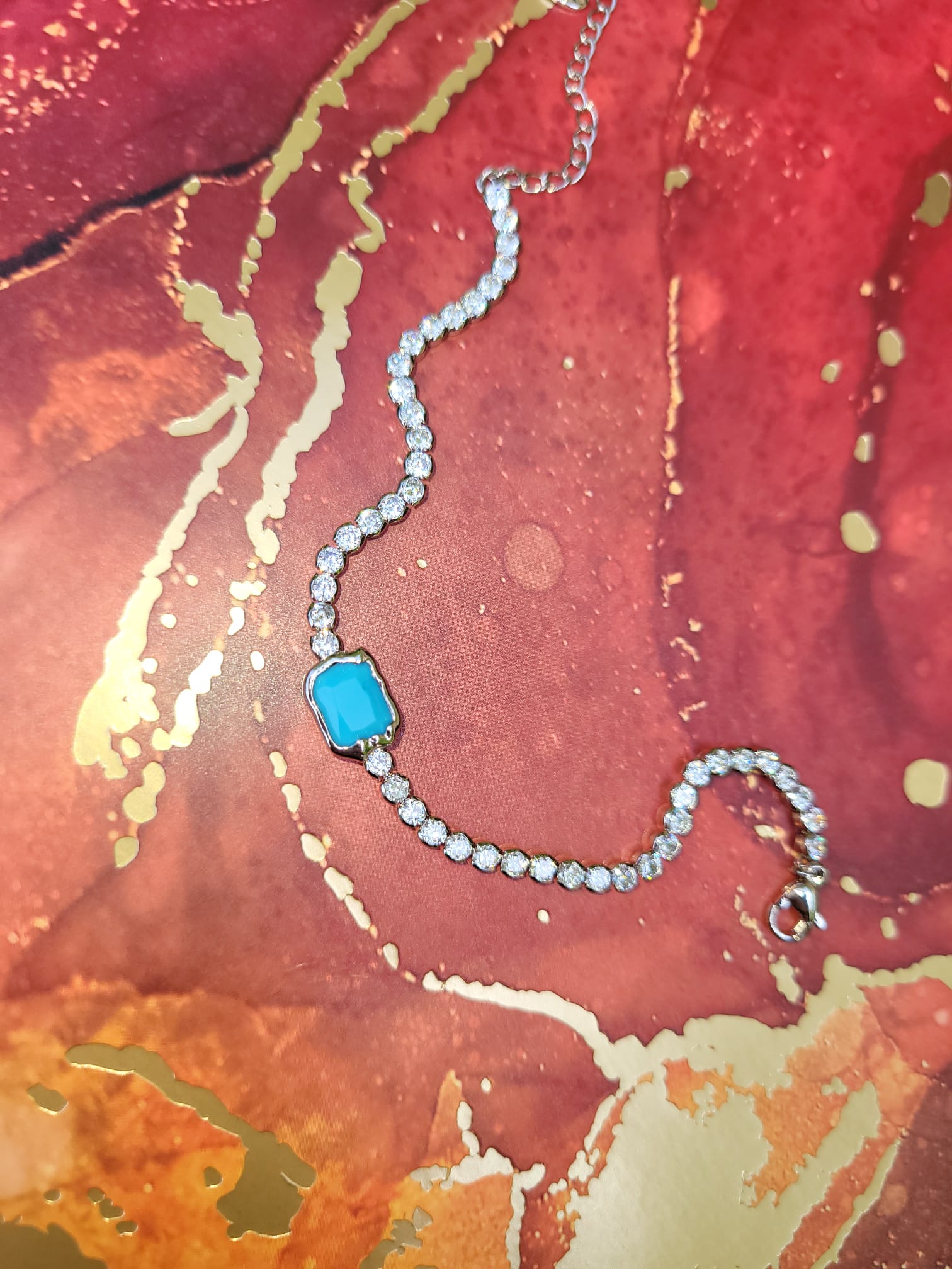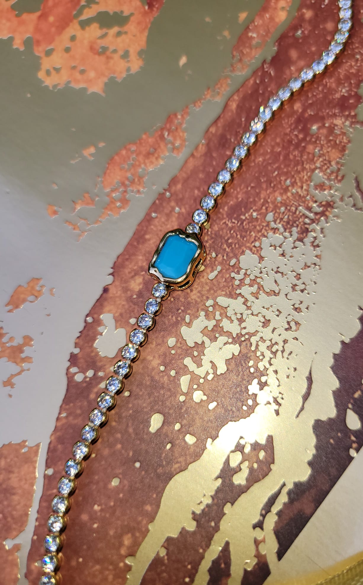 Gourmette alliage de cuivre , zinc et métal finement plaqué or pour le modèle doré et plaqué platinium pour le modèle argenté . Fine et élégante, sertie de zirconiums de taille médium et centrée d'une pierre bleue art "façon Salvador Dali" , certaines auront la référence , nous en sommes certaines ! C'est une des gourmettes qui sont idéales à combiner .